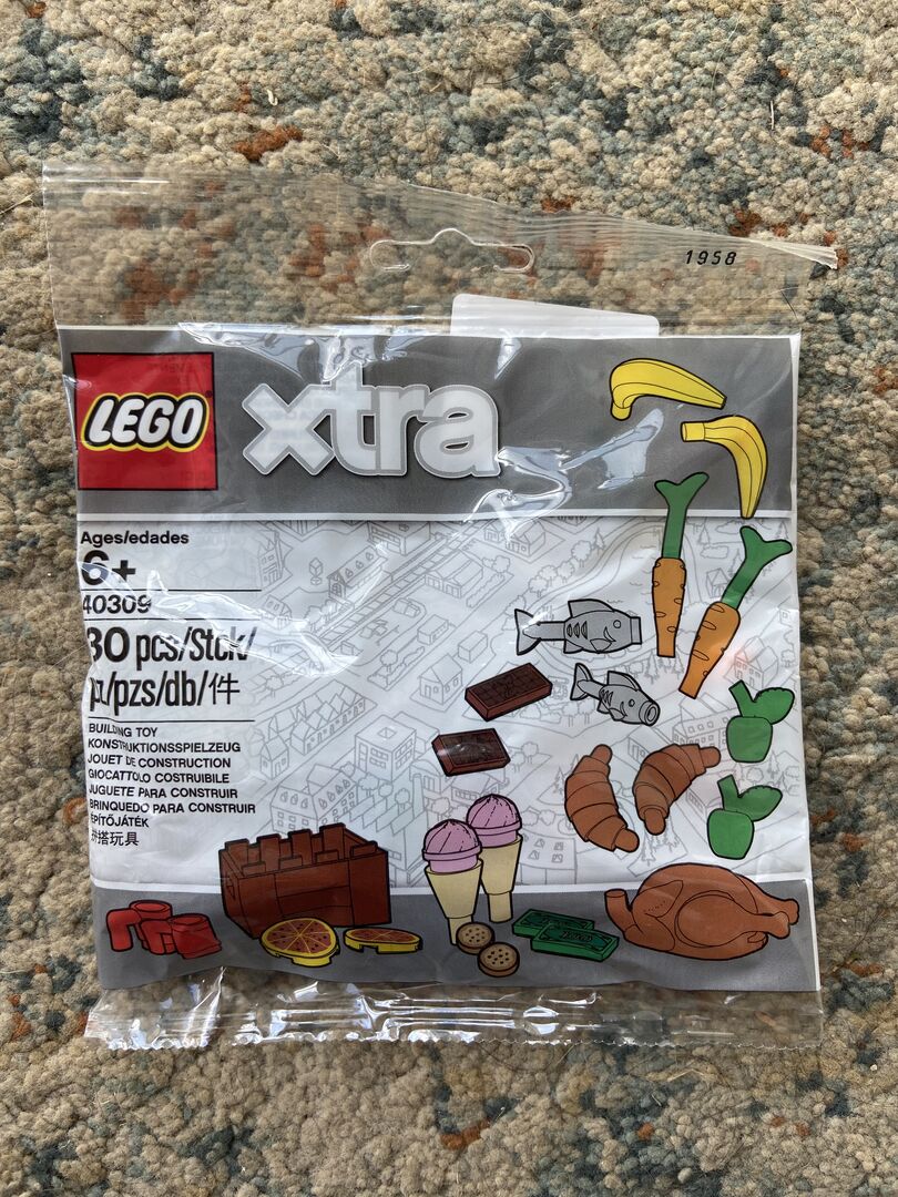 New in Sealed Poly Bag Add some tasty snacks to your LEGO play sets! Play in new and yummy ways with the fun LEGO® xtra 40309 Food Accessories pack! This set of items features a range of foods, including a turkey, croissants, ice creams, fruits, vegetables and different sweet treats, plus a crate and money bills. Combine and use these LEGO xtra accessories with all LEGO sets to enhance children's play in any way they can imagine. This fun pack features 30 food accessory elements, including a crate, turkey and 2 each of chicken legs, fish, ice creams, grapefruit slices, bananas, croissants, carrots, money bills, cookies/muffins, chocolate bars, broccoli and cups. LEGO® xtra packs are compatible with all LEGO sets.