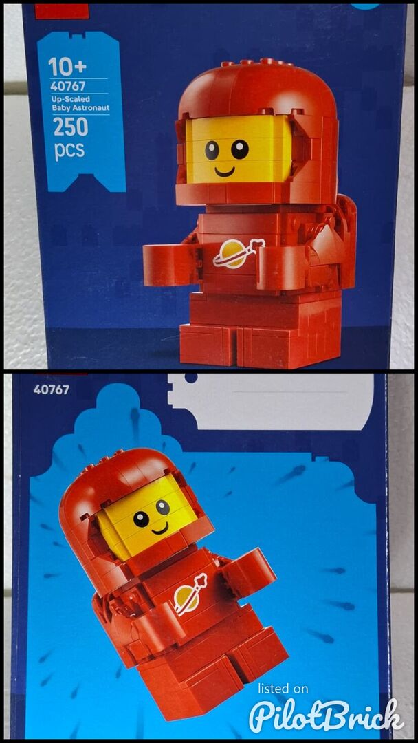 LEGO 40767 Up-Scaled Baby Astronaut is a promotional set released in 2025, containing 250 pieces. The model builds a large-scale version of the red LEGO baby astronaut minifigure, featuring a smiling face, red spacesuit, and a printed Classic Space logo on the torso. Designed as an up-scaled display figure, it recreates the proportions and details of the collectible minifigure in brick-built form.