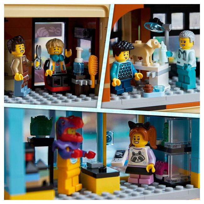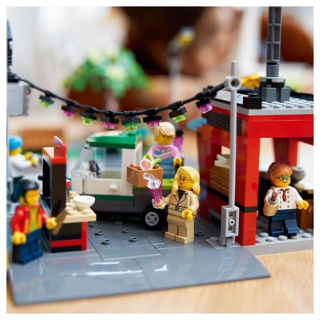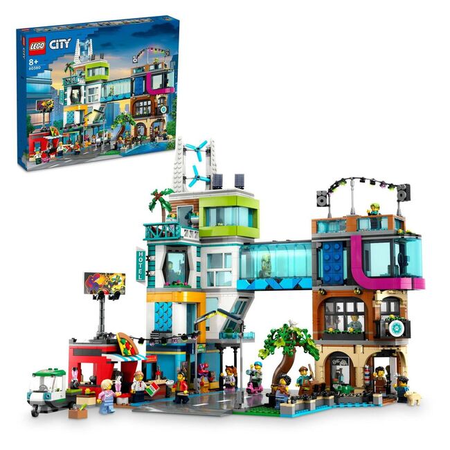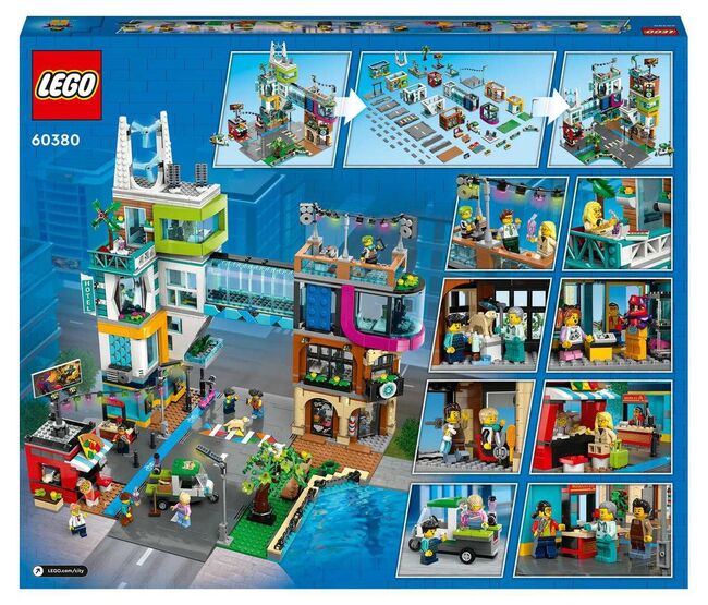 LEGO 60380 Downtown is a City Town set released in 2023, containing 2010 pieces and 14 minifigures. The build depicts a multi-structure city block with a barbershop, vet clinic, blogging studio, rooftop disco, comic store, tech store, janitor’s room, hotel, pizzeria, juice bar, and a noodle stand. The set is titled Downtown in the United States and City Centre in other regions. Its stacked, street-facing modules create a varied urban scene with multiple storefronts and interiors. Box slightly damaged.