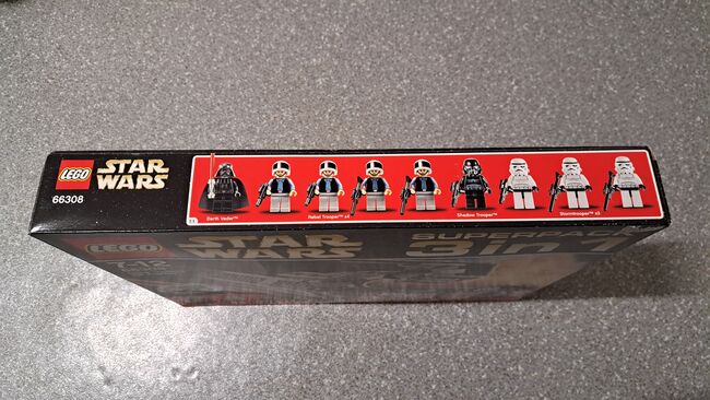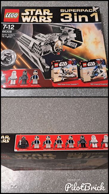 Superpack 3 in 1 original packaging Packaging slightly damaged top right. The set contains the TIE Fighter # 8017, the Rebel Scout Speeder # 7668 and the Imperial Dropship # 7667.