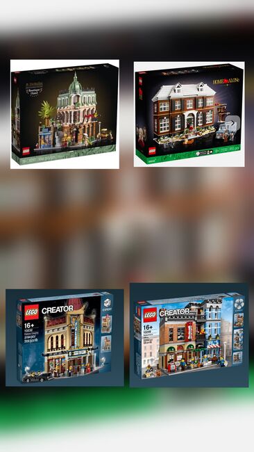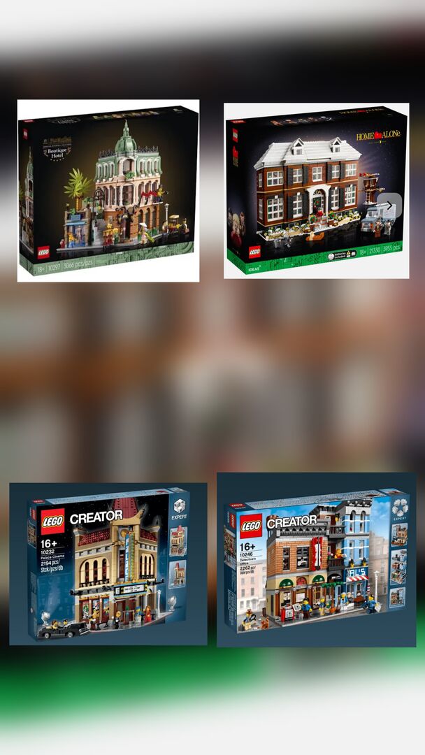 Lego sets for sale. Prefer to sell in 1 time The lego been on display in a display cabinet with minimal dust, comes with all figurines and instruction manual, no box. Lego is carfully packed and stored in bags. - Set 10297 Botique Hotel - year 2022 -pieces 3066 $200 - Set 21330 Home Alone - 2021- 3955 pieces $280 - Set 10278 Police Station - 2021 - pieces 2923 $250 - Set 10218 Pet Shop - 2011 - pieces 2032 $200 - Set 10232 Palace Cinema -2013 - pieces 2194 $280 - Set 10243 Parisien Restaurant - 2014 - pieces 2469 $280 - Set 10246 Detective's Office - 2015 - pieces 2262 $290 - Set 10255 Assembly Square - 2017 - pieces 4002 $280 - Set 10260 Downtown Diner - 2018 - pieces 2480 $300 - Set 10264 Corner Garage - 2019 - pieces 2569 $280,- - Set 10270 Bookshop - 2020 - pieces 2504 $230 - Set 10282 Adidas originals - 2021 - 731 pcs (2x Brand new in box unopened) $100 per set or $190 for both Do a good offer!