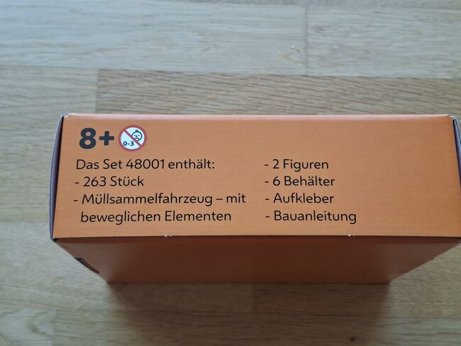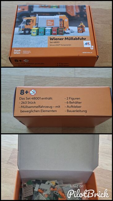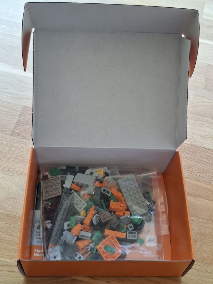 Vienna garbage collection special edition/rarity - Toy made of LEGO bricks to assemble (365 pieces) for children aged eight and over. Once assembled, it consists of a refuse collection vehicle, two figures (man and woman) and six collection bins (residual waste, colored glass, white glass, organic waste, etc.). It illustrates the activities of Vienna's waste collection service as handled by Municipal Department 48 ("Die 48er"), specifically the processes of waste collection and waste separation. There are stickers "Die 48er" and "Bau keine Mist!" on the garbage truck. The game consists of conventional LEGO components that have been supplemented with specific stickers from the 48ers. The name "Set 48001" is of course a reference to the 48. The aim of the game is to illustrate the work of the Viennese refuse collection service, whereby realistic details are important: For example, that the garbage truck has running boards on which the figures can stand with both feet, that the container on the vehicle can be tilted and opened, that the figures are a man and a woman and, of course, that the entire range of separate collection is visible. Source: https://www.technischesmuseum.at/museum/online-sammlung#sammlung/ui//objectdetail/605583, retrieved on 6.4.2026